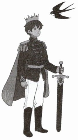 在城市的高柱上,快乐王子的雕像上镀满了薄薄的金叶,双眼是两颗璀璨的蓝宝石,剑柄上镶嵌着一颗巨大的红宝石。他非常引人赞叹。一名市议员称赞他非常漂亮,但随即补充说“只是不太实用”。