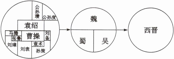 【答题思路】首先确定各个示意图所处的历史阶段,通过袁绍、曹操、刘备等人物可以推断出第一个时期为东汉末年,这一阶段的特征是军阀割据;第二个阶段是魏、蜀、吴三国鼎立时期;第三个阶段是西晋的统一。通过对三幅图的整体把握可以看出,从军阀林立到三国鼎立再到西晋统一,统一趋势不断加强,D项符合题意。东汉末年军阀割据只体现了第一幅图,排除A项。魏晋时期政权分立包括三国鼎立阶段、魏灭蜀后魏吴对峙阶段和晋代魏后晋吴对峙阶段,从图中无法得出这一结论,排除B项。三国鼎立局面形成只体现了第二幅图,排除C项。