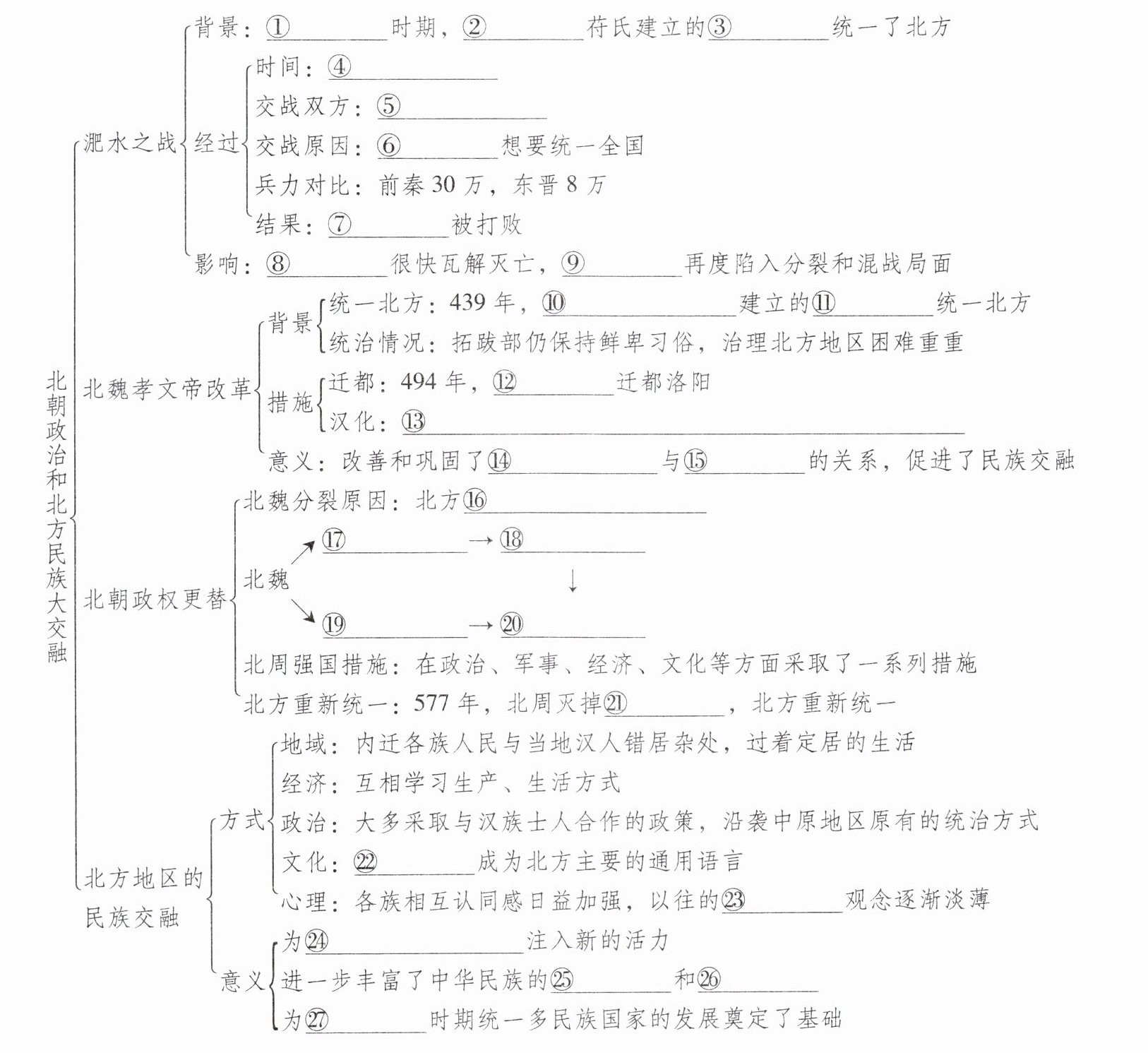①十六国 ②氐人 ③前秦 ④383年 ⑤前秦和东晋 ⑥苻坚 ⑦前秦 ⑧前秦 ⑨北方 ⑩鲜卑拓跋部 ⑪北魏 ⑫孝文帝 ⑬说汉语,穿汉服,改汉姓,鼓励鲜卑贵族与汉人贵族通婚 ⑭鲜卑拓跋部 ⑮汉人 ⑯六镇兵变 ⑰东魏 ⑱北齐 ⑲西魏 ⑳北周 ㉑北齐 ㉒汉语 ㉓“胡”“汉” ㉔中华民族发展 ㉕物质文化 ㉖精神文化 ㉗隋唐