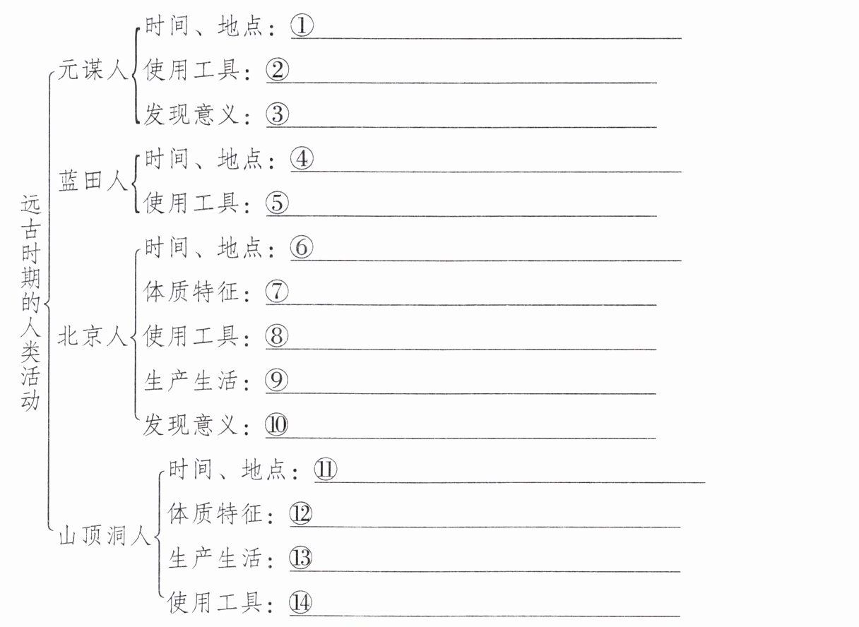 ①距今约170万年,云南元谋 ②粗糙的石器 ③是我国境内目前已知最早的古人类之一 ④距今约160万年,陕西蓝田 ⑤能够制作和使用工具 ⑥距今约70万—20万年,北京周口店龙骨山 ⑦上肢与现代人相似,下肢较上肢略长,能够直立行走,面貌保留了猿的一些特点,脑容量比现代人小 ⑧能够用石块、兽骨和鹿角等制成不同类型的工具 ⑨已经会使用火;群体生活 ⑩对研究人类起源和古人类演化的历史具有重要意义 ⑪距今约3万年,北京周口店龙骨山 ⑫模样和现代人相同 ⑬知道人工取火,靠采集、狩猎为生,会捕鱼,会缝制衣服,有爱美意识,有埋葬死者的行为,集体生活 ⑭使用打制石器,开始制作骨器,掌握了磨光和钻孔技术