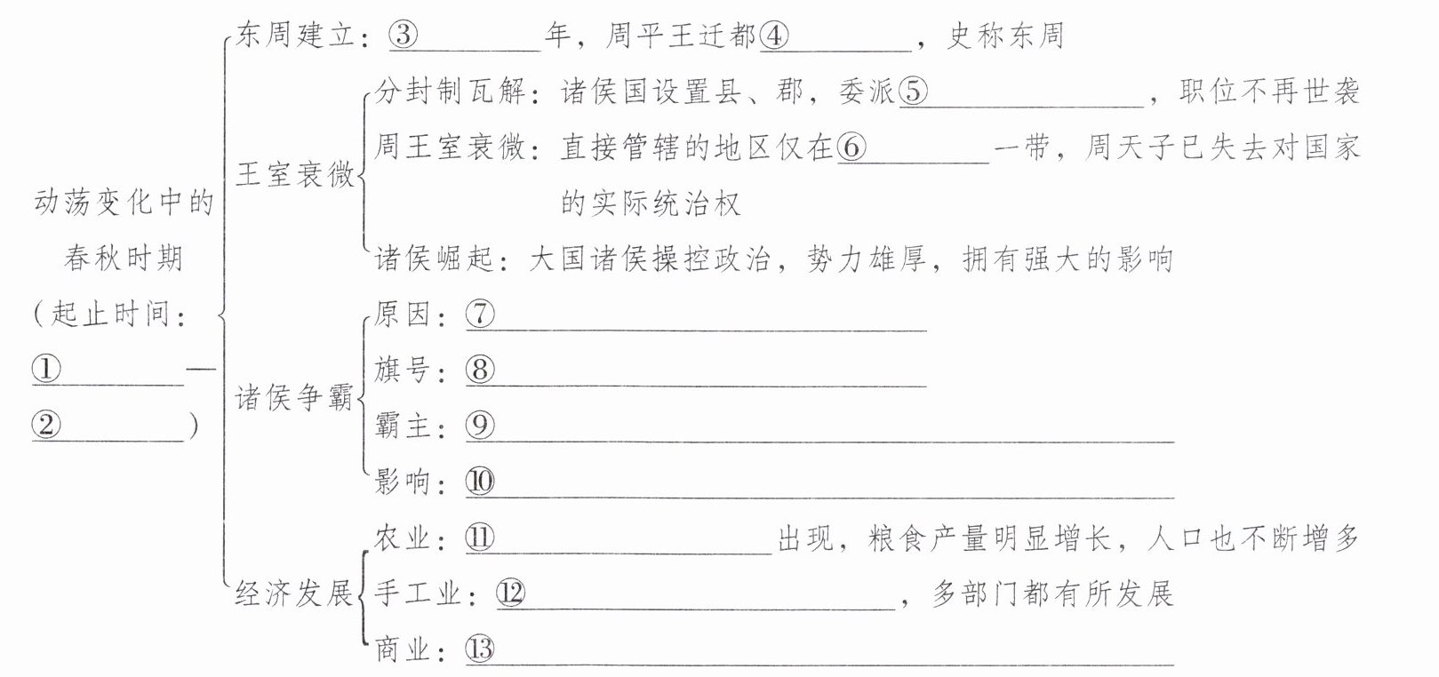 ①公元前770 ②前476年 ③公元前770 ④洛邑 ⑤官员直接管理 ⑥洛邑 ⑦追逐自身的利益 ⑧“尊王攘夷” ⑨齐桓公、晋文公、楚庄王等 ⑩有利于局部统一;为民族交融创造了契机 ⑪铁制农具和牛耕 ⑫规模扩大,分工细致 ⑬商业活动活跃,金属货币使用较为广泛