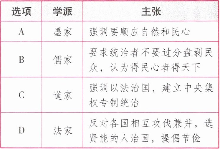 【答题思路】A项墨家主张“兼爱”“非攻”,选贤能的人治国,提倡节俭;C项道家主张顺应自然和民心;D项法家主张以法治国,建立中央集权专制统治。三项对应关系都是错误的,故排除。B项反映了儒家“仁政”的思想主张,是正确选项。
