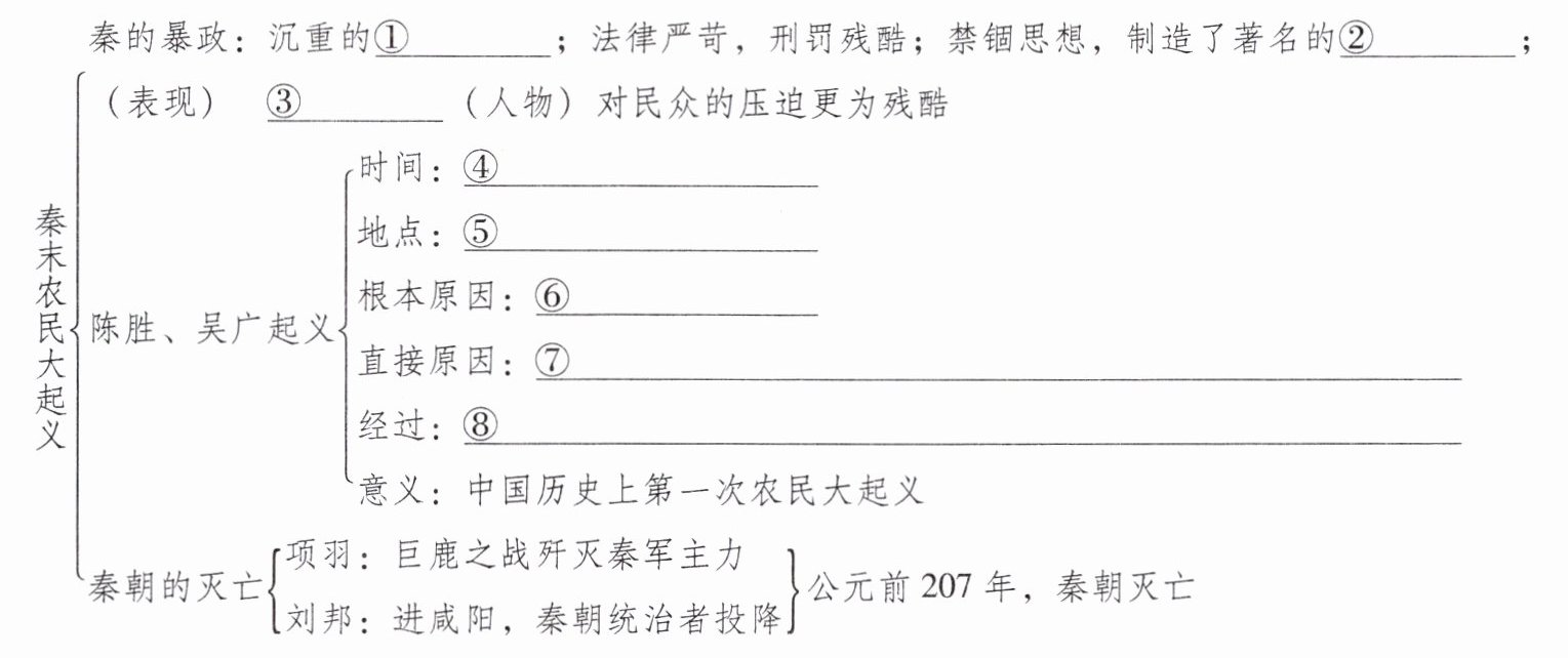 ①赋税、徭役、兵役;②“焚书坑儒”;③秦二世;④公元前209年;⑤大泽乡;⑥秦的暴政;⑦不能按期到达渔阳,误期要被处死;⑧大泽乡起义→在陈县建立政权→攻打咸阳→失败