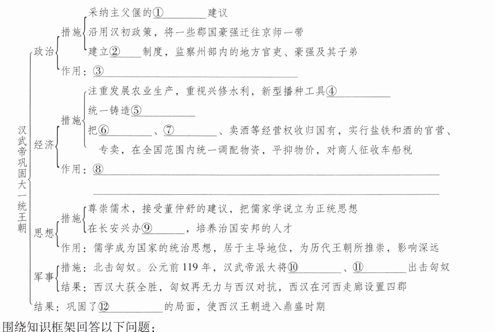围绕知识框架回答以下问题:汉武帝在位时,西汉王朝国力强盛,版图拓展,这与汉武帝巩固大一统的哪些措施有关?