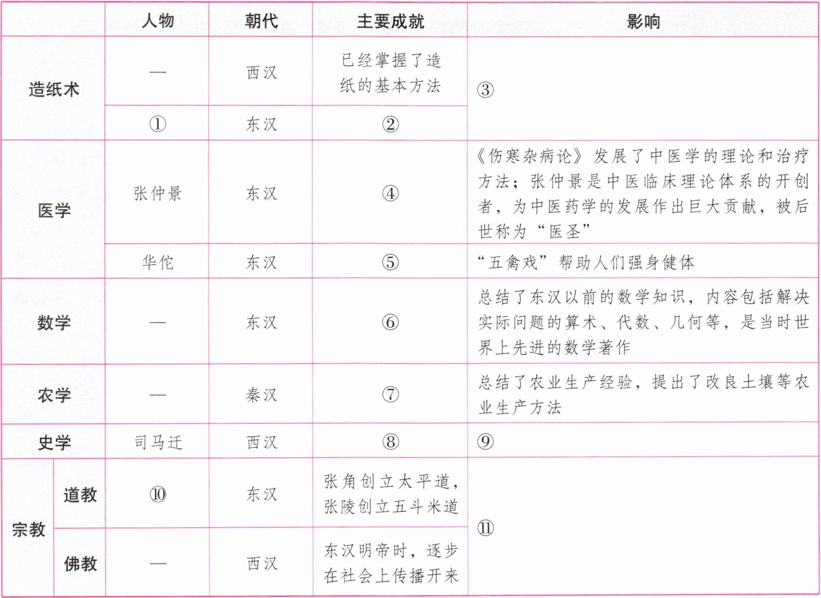 ①蔡伦 ②改进造纸术 ③纸成为人们广泛使用的书写材料,便利了典籍的流传。造纸术的发明,是中国对世界文明的伟大贡献之一 ④《伤寒杂病论》 ⑤发明“麻沸散”,创编“五禽戏” ⑥《九章算术》 ⑦《氾胜之书》 ⑧《史记》 ⑨我国古代第一部纪传体通史,对我国史学发展产生了深远影响,在文学史上也有重要地位 ⑩张角、张陵 ⑪在社会、思想、文学以及建筑、雕刻、绘画等方面产生深远影响