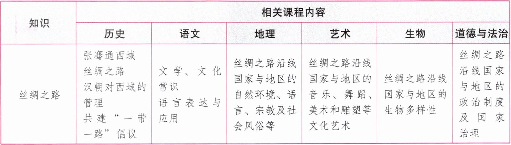 |丝绸之路|历史:张骞通西域 丝绸之路 汉朝对西域的管理 共建“一带一路”倡议语文:文学、文化常识 语言表达与应用地理:丝绸之路沿线国家与地区的自然环境、语言、宗教及社会风俗等艺术:丝绸之路沿线国家与地区的音乐、舞蹈、美术和雕塑等文化艺术生物:丝绸之路沿线国家与地区的生物多样性道德与法治:丝绸之路沿线国家与地区的政治制度及国家治理|
