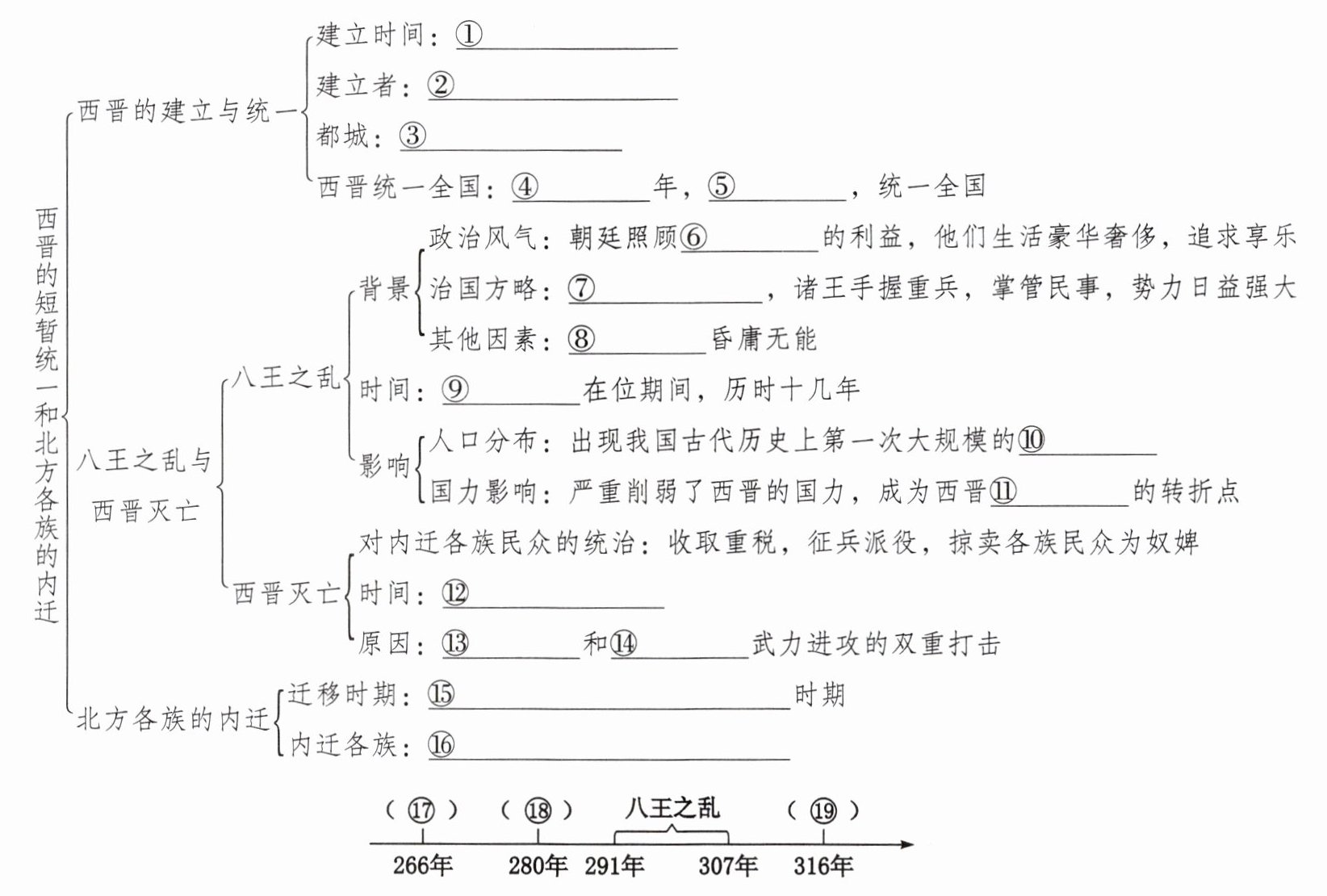 ①266年 ②晋武帝司马炎 ③洛阳 ④280 ⑤西晋灭吴 ⑥世家大族 ⑦大封同姓诸王 ⑧晋惠帝 ⑨晋惠帝 ⑩人口迁徙 ⑪由盛而衰 ⑫316年 ⑬八王之乱 ⑭内迁各族 ⑮东汉、魏、晋 ⑯氐、羌、匈奴、羯、鲜卑 ⑰西晋建立 ⑱统一全国