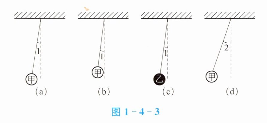 5. 某同学在课上听了伽利略对摆的研究故事之后,回家用支架、细绳、甲和乙两个质量不同的小球和秒表研究摆球摆动一次所需时间和哪些因素有关。他分别设计了 4 次实验,如图 1 - 4 - 3 所示,每次实验各有不同,摆动的角度$\angle 1小于\angle 2$,甲球的质量比乙球的大。图(a)(c)(d)中的摆线的长度相同,图(b)中的摆线最短。