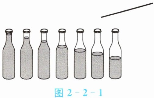方案一:在7个相同的玻璃瓶中灌入不同高度的水,仔细调节水的高度。敲击它们就可以发出“do,re,mi,fa,sol,la,si”的声音来,如图2-2-1所示。