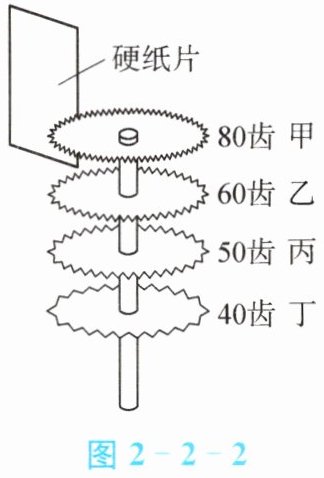 2. 固定在同一根轴上的四个齿数不同的齿轮,如图2-2-2所示,用皮带轮带动它们一起转动。现用一硬纸片依次接触每一个齿轮,发现硬纸片振动越快,频率越