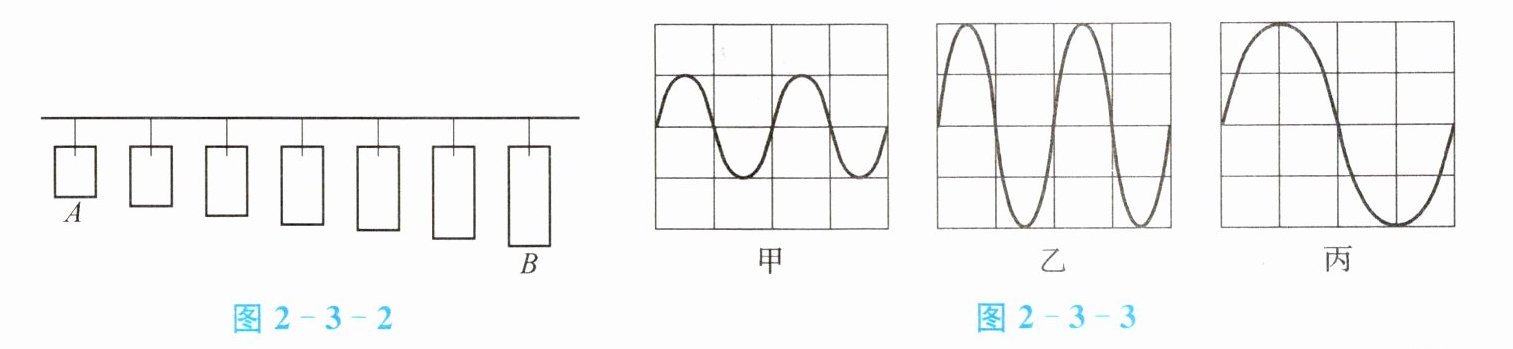 3. 如图2-3-2所示,用同种瓷砖切成宽度相同而长度不同的砖条,敲击时,能发出悦耳动听的声音。图2-3-3中,甲、乙、丙分别是三次敲击砖条时示波器在相同时间内截取的声波波形,用较小的力轻敲其中一个砖条产生的波形是