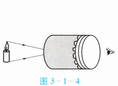 10. 小明同学在课外用易拉罐做成如图3-1-4所示的装置做小孔成像实验,如果易拉罐底部有一个很小的三角形小孔,则他在半透明纸上看到的像是(