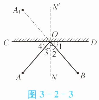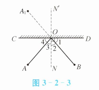 8. 在探究光的反射规律时,老师把一块平面镜$CD$竖立在讲台上,坐在$B点的甲同学通过平面镜看到了坐在A$点的乙同学(图3-2-3)。在这一现象中,光线的反射角是(