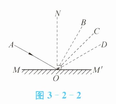 7. 如图3-2-2所示,$MM'$为平面镜,$AO$为入射光线,$ON$为法线,入射光线与平面镜的夹角为$\angle AOM = 30^{\circ}$,则入射角大小为