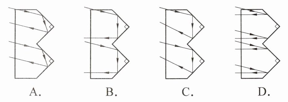 10. 夜晚,当汽车车灯发出的光照射到自行车尾灯上时,司机看到自行车尾灯反射的光,就能及时避让。图3-2-4中有关自行车尾灯的光路图正确的是(