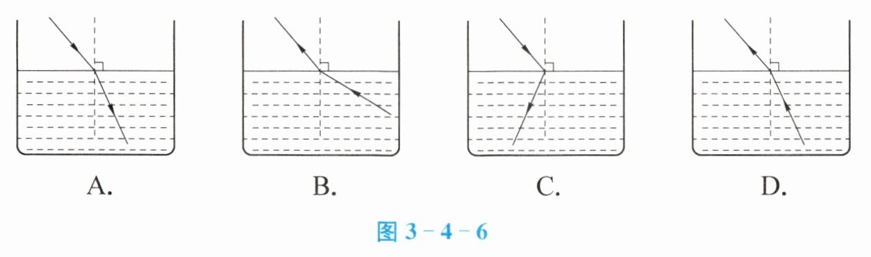 8. 小强在练习潜水时,岸上的教练能透过水面看到水下的小强,图3-4-6中,能正确反映这个光路的是(