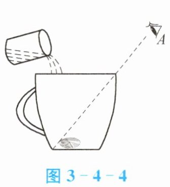 6. 如图3-4-4所示,小明将一枚纪念币放在杯底,眼睛在$A$处恰好看不到它,沿杯壁缓缓向杯中加水,小明在$A$处又能看到“纪念币”。造成这一现象的原因是光从