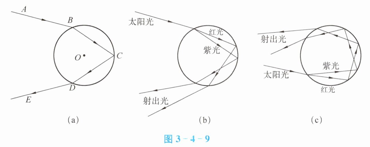 虹和霓都是因为阳光照射到空中圆球形的小水滴时,发生光的折射及反射而形成的,图3-4-9(b)所示为虹的形成光路,图3-4-9(c)所示为霓的形成光路。