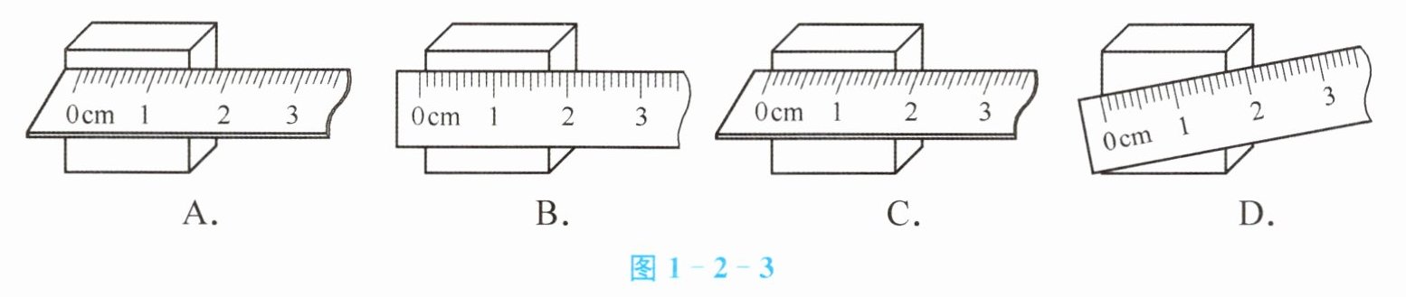 11. 用一把较厚的刻度尺测量木块的长度,图1 - 2 - 3所示的四种方法中,正确的是(