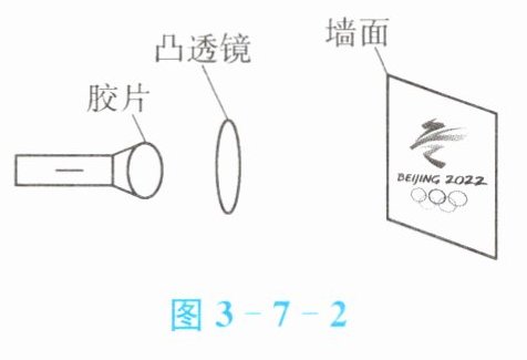 3. 小明自制了一个简易投影仪(图3 - 7 - 2),在暗室中将印有北京2022年冬奥会标志的透明胶片贴在手电筒上,并让灯光正对着焦距为10 cm的凸透镜,调节手电筒、凸透镜、白色墙壁之间的位置,在墙上得到了一个清晰的正立、放大的像。则下列说法中正确的是(