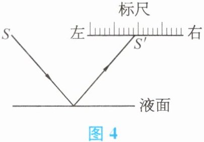 ;光经液面反射后射到液面上方水平标尺上的 $S'$ 点,当液面下降时,光点 $S'$向右