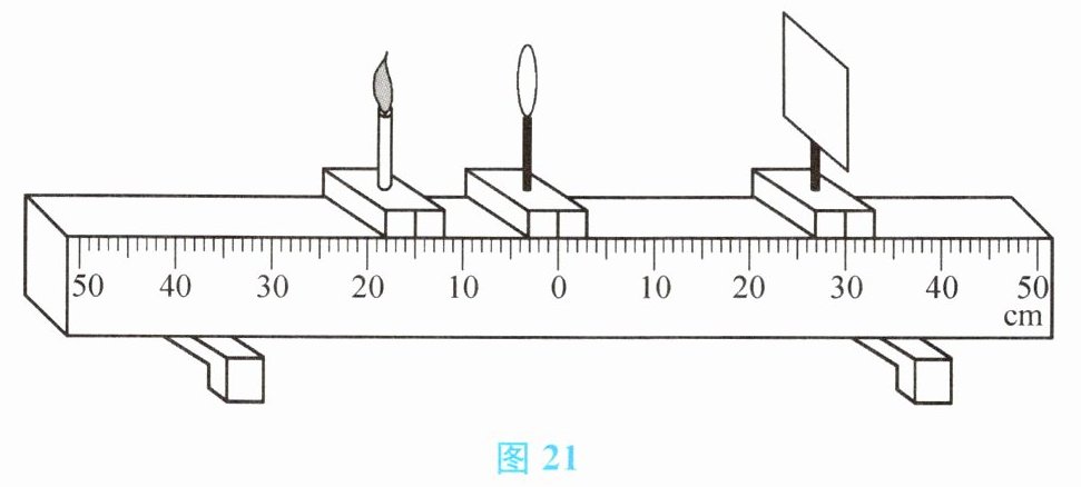 。(2) 当凸透镜、点燃的蜡烛和光屏处于如图 21 所示的位置时,在光屏上能得到清晰的像,则该像是