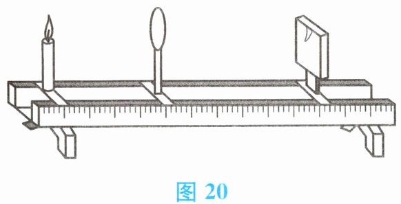 $cm$。(2) 实验过程中,发现烛焰在光屏上的像清晰但不完整(图 20)。若要使烛焰在光屏中心成像,只调节光屏,应将光屏向