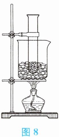 14. 把盛有碎冰块的大试管插入烧杯里的碎冰块中,用酒精灯在烧杯底部慢慢加热,如图8所示。当烧杯中的冰块大部分熔化时,试管中的冰块(