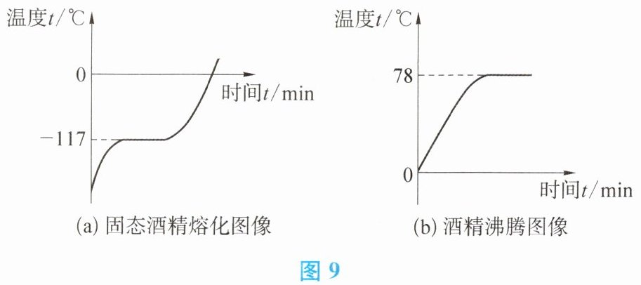 16. 如图9所示,图(a)、(b)分别是酒精在1个标准大气压下熔化和沸腾时温度随时间变化的图像,下列说法正确的是(