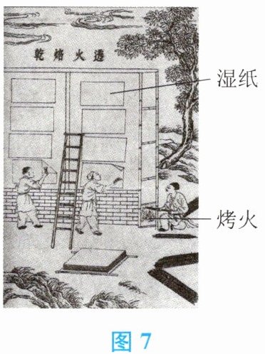 13. 《天工开物》记载的“透火焙干”是造纸的一道工序,其做法是将刚生产出的湿纸张贴在烤火的墙上(图7),给墙壁烤火能加快湿纸变干的主要原因是(