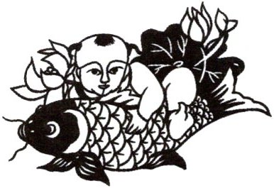 示例 画面内容:一个胖小孩儿怀抱一条肥大的鱼,小孩儿身后两侧是荷叶、荷花。寓意:连年有余(“年年有余”或“喜庆有余”)。