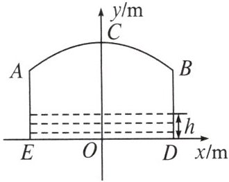 如图,某小河上有一拱桥,拱桥及河道的截面轮廓线由抛物线的一部分 \( ACB \) 和矩形的三边 \( AE \),\( ED \),\( DB \) 组成,已知河底 \( ED \) 是水平的,\( ED = 16m \),\( AE = 8m \),抛物线的顶点 \( C \) 到 \( ED \) 的距离是 \( 11m \)。以 \( ED \) 所在的直线为 \( x \) 轴,抛物线的对称轴为 \( y \) 轴建立平面直角坐标系。