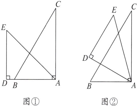 2. 有两个直角三角形纸板,一个含 $ 45^{\circ} $ 角,另一个含 $ 30^{\circ} $ 角,按如图①所示方式叠放,先将含 $ 30^{\circ} $ 角的纸板固定不动,再将含 $ 45^{\circ} $ 角的纸板绕顶点 $ A $ 顺时针旋转,使 $ BC // DE $,如图②所示,则旋转角 $ \angle BAD $ 的度数为(