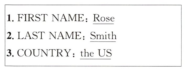 1. What's her first name? 2. What's his last name? 3. What country are you from?