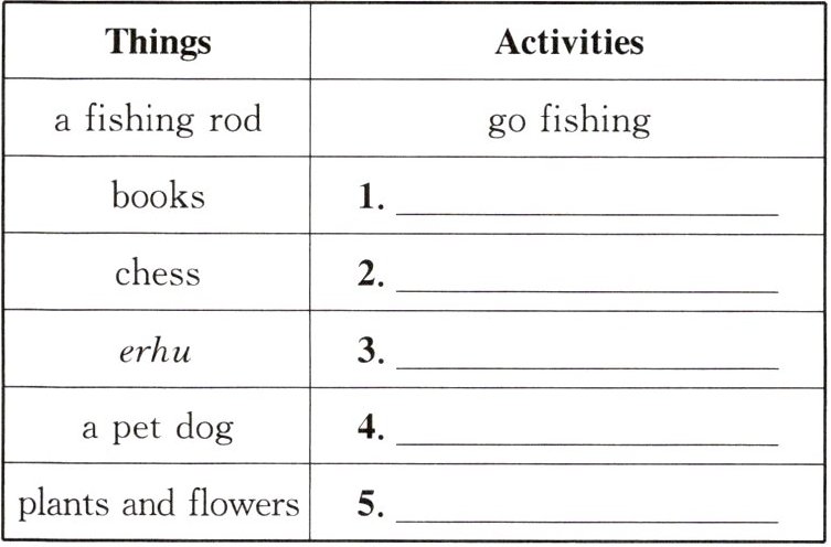 1. read books 2. play chess 3. play the erhu 4. love animals 5. like gardening(答案不唯一)