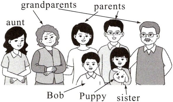 Hello, I'm Bob. Here is a nice photo of my family. My grandpa is on the left of my dad, and my grandma is on the left of my aunt. My parents are in the middle. The handsome man with glasses is my dad, and the beautiful woman next to my dad is my mum. The girl with big eyes and long hair is my sister. Who is the little boy? Haha! It's me! Puppy the dog is in the photo too. I love my family. We love and help each other.