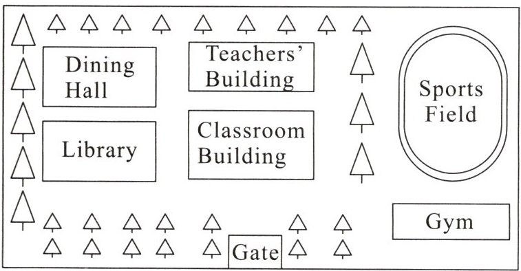 As you can see from the map, our school is full of greenery with trees everywhere. In the center, there is the classroom building where we have our daily classes. To the left of the classroom building is the library. We go there every Tuesday for Reading Club. Behind the library, you can find the dining hall, where we enjoy delicious meals. Next to the dining hall stands the teachers’ building.