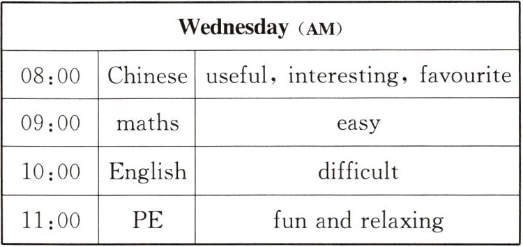 I'm very busy on Wednesday morning. At 8:00 I have Chinese. I think it's useful and interesting. So it is my favourite subject. Then at 9:00 I have maths. It is easy. I have English at 10:00. The teacher says English is very useful,but I think it's very difficult. After that,we have PE at 11:00. We all like PE class,because it is fun and relaxing.