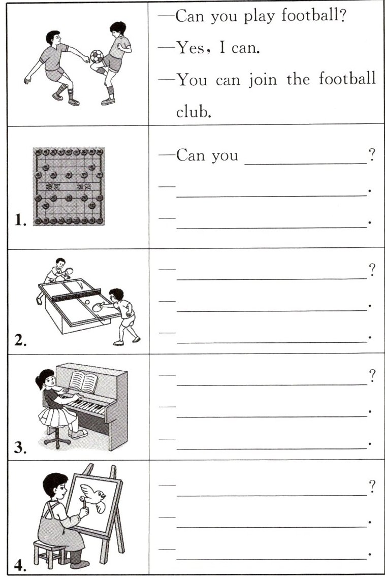 1. play Chinese chess Yes, I can You can join the Chinese chess club 2. Can you play ping-pong Yes, I can You can join the ping-pong club 3. Can you play the piano Yes, I can You can join the music club 4. Can you draw Yes, I can You can join the art club
