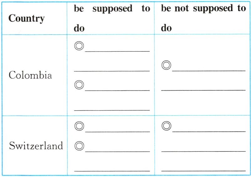 任务二:预习 Section A 3a,将哥伦比亚人和瑞士人应该做或不应该做的事情填写在表格中。