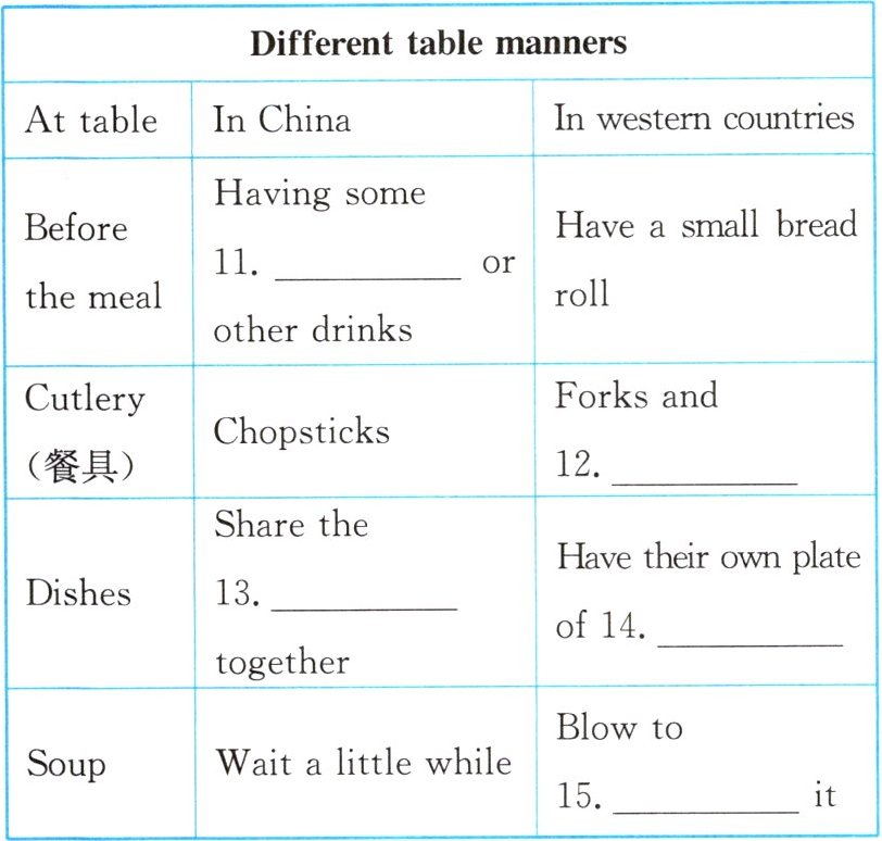 11.tea 12.knives 13.dishes 14.food 15.cool