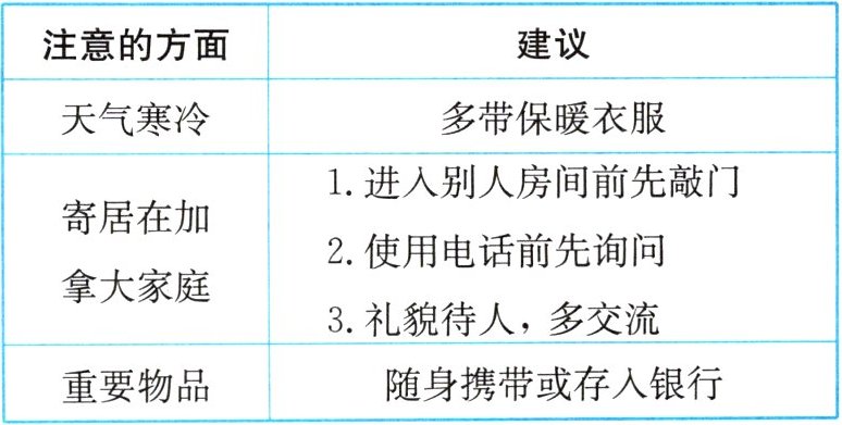 Now I want to give you some advice. The weather in Canada in November is quite cold, so you'd better bring more warm clothes with you. What's more, because you will live with a Canadian family, you have to remember not to enter others' room without knocking at the door. Before you use the phone, please ask the family first. Everything will be fine if you are polite and ready to talk to them. They will enjoy having you in the house. As for something important, such as money, you should carry it with you all the time or keep it in the bank. Hope you will enjoy your life there.