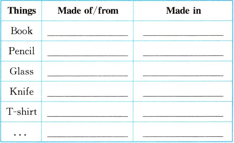 任务:搜集你身边的常见物品,如课本、铅笔、水杯、小刀、衣服等等,两人一组进行对话,询问其产地、构成等问题,然后完成下面的表格。