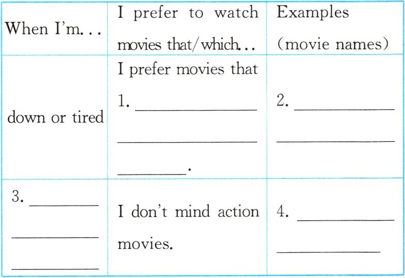 任务二:1. can cheer me up 2. Men in Black / Kung Fu Panda 3. sad or tired 4. Spider-Man