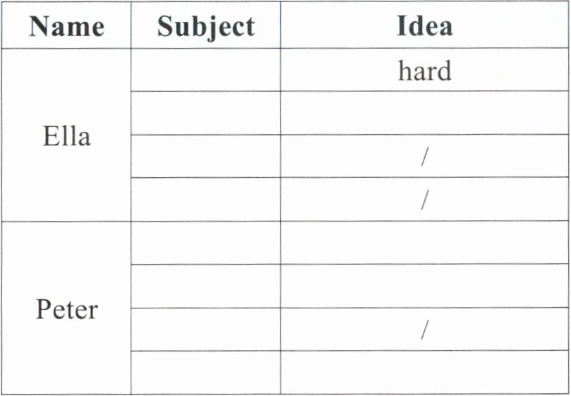 Ella: ⑨; ② fun; ⑧; ⑥ Peter: ① fun; ② boring; ④; ⑤ exciting