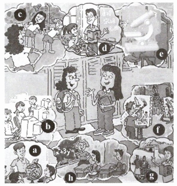 二、回归教材 根据教材1b部分(P44)的内容,将方框中的序号填入图表;并写出埃拉与彼得对相关学科的看法。