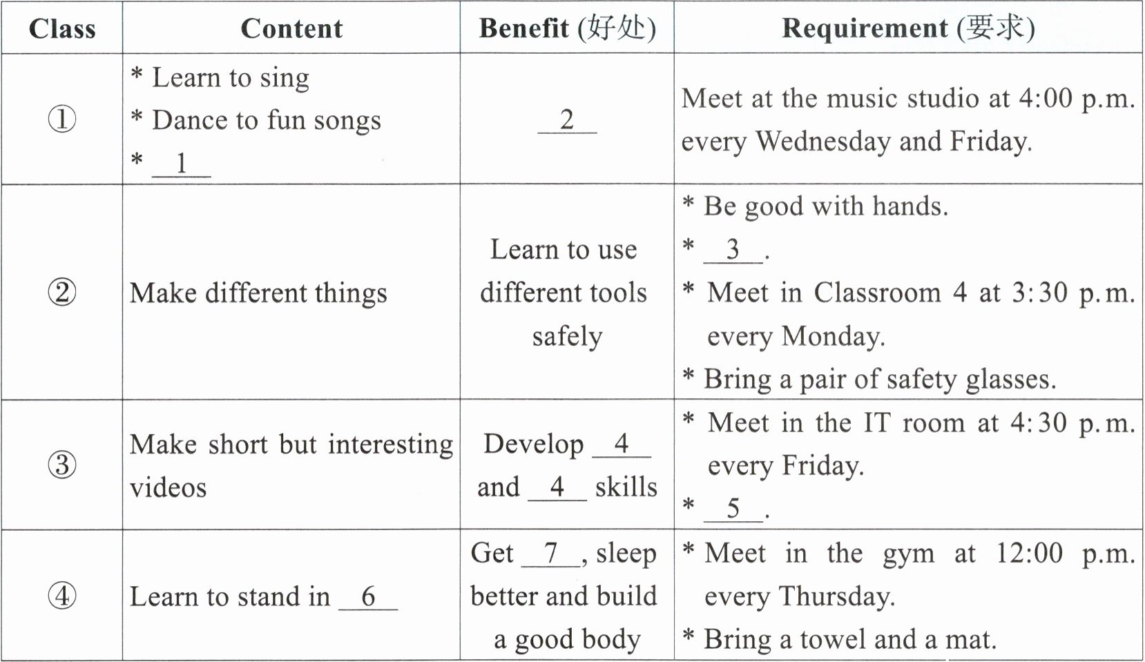 8. To ask students to take the classes. 9. ①-D; ②-C; ③-B; ④-A 10. 60 minutes / an hour; 45 minutes 11. A 12. A