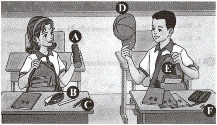 ) 4. What does Teng Fei have in his schoolbag? ① A cap ② Some books ③ A bottle ④ Some keys