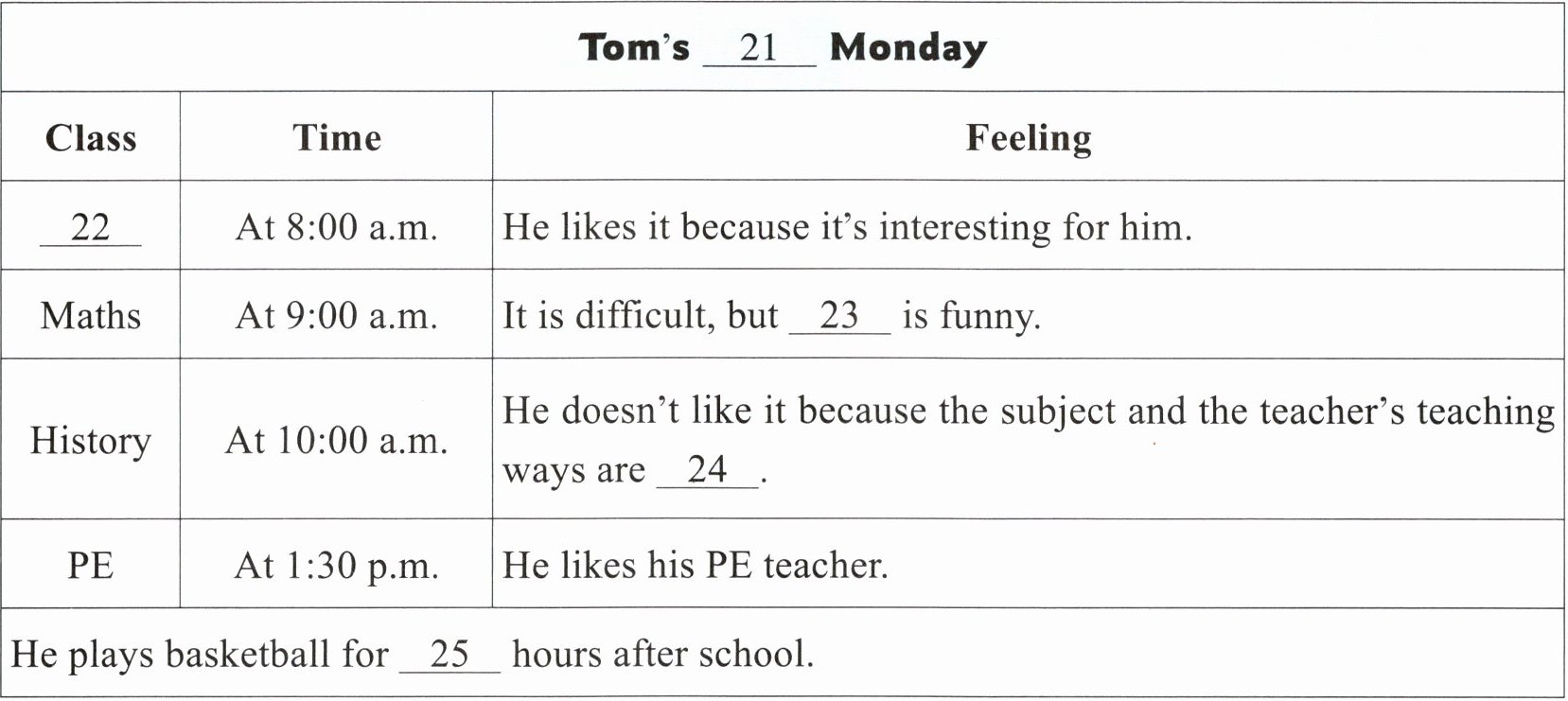 21.busy 22.English 23.the teacher 24.boring 25.two/2
