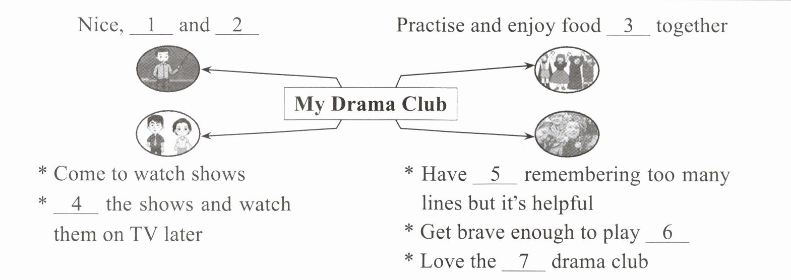 * Alice loves the drama club because she has a 8, harvests (收获) nice 9, enjoys parents' 10 and 11 time and improves her 12.